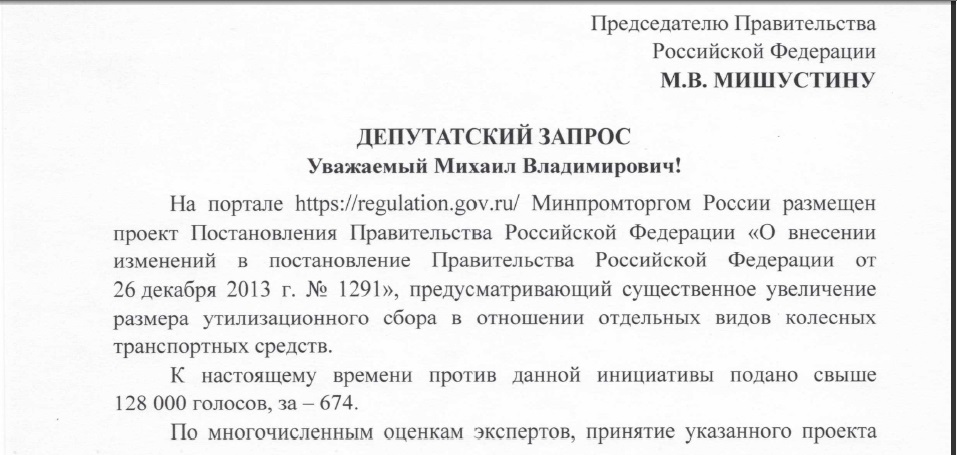 В депутатском запросе сказано: «По многочисленным оценкам экспертов, принятие указанного проекта нормативного правового акта вызовет существенное падение рынка импорта (до минус 50%) и удорожание большинства популярных среди российских семей марок на несколько миллионов рублей, что сделает для них невозможным приобретение автомобиля. Особенно негативно это отразится на регионах Дальнего Востока и Сибири, где граждане в основном пользуются ввозимыми из-за границы автомобилями, поскольку предлагаемый проект прямо влияет на возможность приобретать подержанные иностранные автомобили среднего класса в возрасте 3-5 лет и старше, что востребовано среди дальневосточников. На Дальнем Востоке японские и южнокорейские марки автомобилей хорошо зарекомендовали себя у семей с детьми, а также при езде по сложному рельефу и плохим дорогам. Многие из них подпадают под новые критерии повышения утилизационного сбора как по количеству лошадиных сил, так и по принадлежности к гибридам или электрокарам».