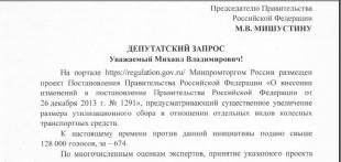 14 октября депутаты Госдумы фракции КПРФ А.В. Корниенко, Н.А. Останина, М.Н. Прусакова, С.Г. Левченко и С.П. Обухов направили запрос премьер-министру М.М. Мишустину с просьбой пояснить планы правительства по резкому повышению утилизационного сбора в отношении импортируемых автомобилей с двигателями мощностью свыше 160 л.с. В частности, законодатели попросили дать ответ на вопрос о том, каковы цели и причины очередного изменения расчета размера утилизационного сбора, как количество лошадиных сил автомобиля влияет на процесс его утилизации и каковы риски роста социальной напряженности в обществе из-за роста цен на авто, который последует после принятия соответствующего постановления.