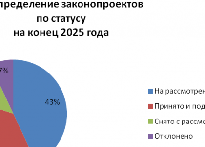 В результате за период подготовлено 30 законопроектов, из них принято и подписано11, снято с рассмотрения 4, отклонено 2.